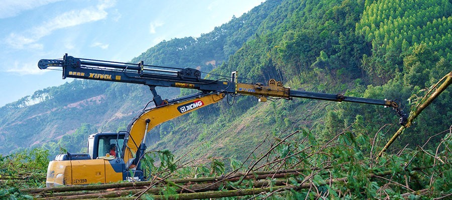 高效環保,適用多種作業模式:四節臂設計方案使得伸縮臂的作業半徑更長,每節伸縮臂的強度更高,縮回總長度更短更適合林業轉運,鋼絲繩上置,伸縮時輔助拉住伸縮臂,設計更合理;配有360°全回轉夾具,具備吊裝能力和伐木機搭配工作;超長的延展臂可以進行大范圍施工作業,將伐到的樹木收集在一起;主要用于林業按樹、松樹、杉樹等拉山歸堆,適應于山地林業作業,開山拓荒等。設計可調整角度的伸縮臂結構,比傳統的伸縮臂更方便更靈活,油管放松裝置,預防長時間施工油管跳出導致損壞,鐘擺式結構的回轉馬達,柔性連接方式吸收回轉沖擊。